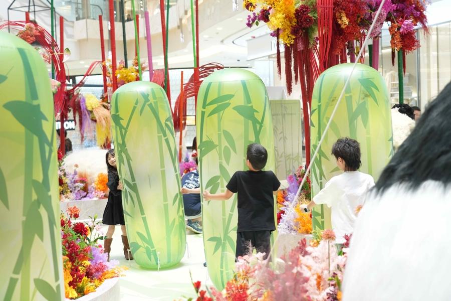 在一樓中庭,首先映入眼簾的是整座樂園中心高達4米的萌趣熊貓裝飾,它雙手托腮,似乎在沉思竹林間的趣事,又像是在等待與過往客人來一場心靈對話,彷彿被賦予了靈動的生命力。六隻姿態各異的花藝熊貓散落周圍,有的慵懶地躺臥在花叢邊,四肢舒展,有的則像好奇的孩童,半趴在花叢中,圓溜溜的眼睛裏滿是好奇與探索的慾望。竹林以挺拔之姿向上生長,象徵着堅韌與蓬勃的生命力,而五彩斑斕的花卉如夢幻般輕柔地環繞着熊貓與竹林,爲整個場景注入了神祕的色彩。