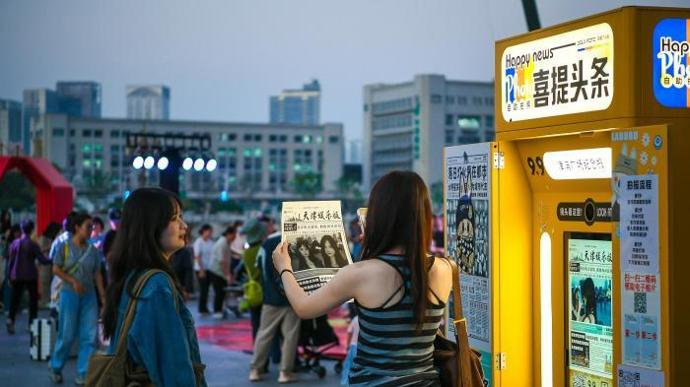 國慶中秋假期,“自助拍報機”在全國各大主要景點爆紅。從杭州西湖到天津津灣廣場,不少遊客對着鏡頭合影,通過“拍報機”即可獲得一張仿報紙樣式的紙張,讓剛拍下的照片登上“頭版頭條”。在哈爾濱中華巴洛克風情街,今年五一長假期間,一臺能掃碼生成專屬頭版報紙的拍報機,日均接待量突破800人次,節假日期間甚至需啓動限流措施。