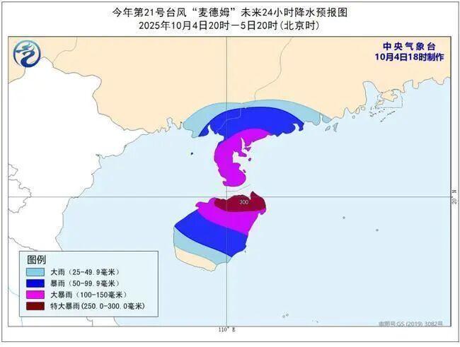 降水預報:4日夜間到5日白天,海南島大部有大到暴雨,其中海南島北部有大暴雨,局地特大暴雨(250~300毫米);5日白天,廣東西南部、廣西東南部有大到暴雨,局地有大暴雨。