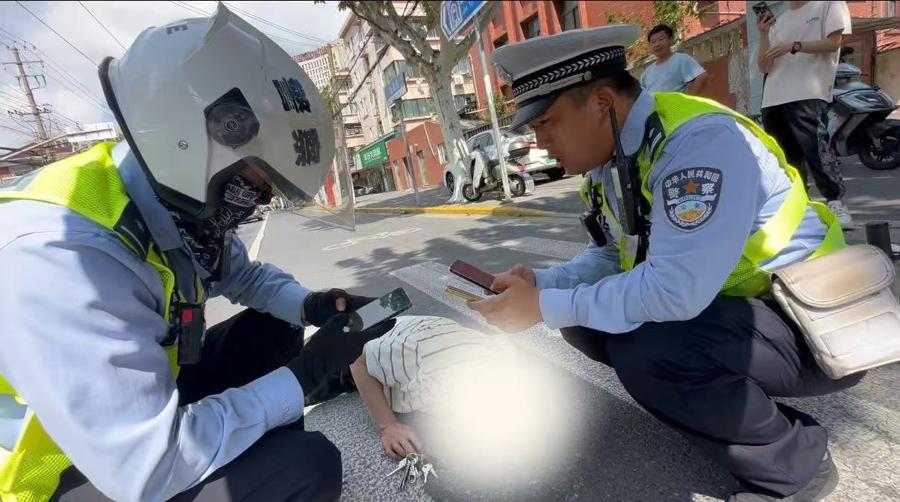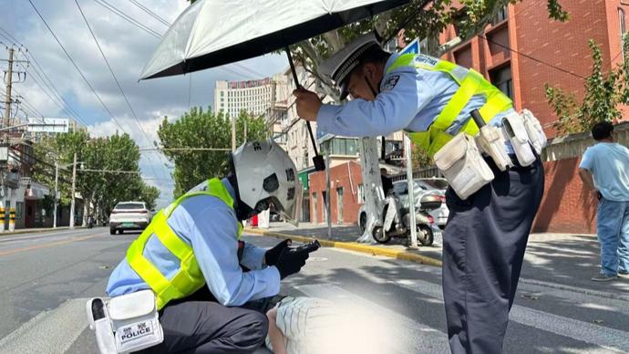 5分鐘後,楊浦交管支隊二大隊民警魏強、蔣毅攜帶應急物品趕到現場。當天最高溫度接近35℃,民警魏強爲老人撐起遮陽傘,避免烈日直射加重身體不適;民警蔣毅則蹲在老人另一側,一邊輕聲安撫,一邊根據老人提供的信息聯繫其家屬,詳細說明情況:“老人在路口過馬路時不慎摔倒,我們已經在現場陪着,120馬上就到,您直接去醫院就行,別太着急。” 電話那頭的家屬連連道謝,懸着的心稍稍放下。