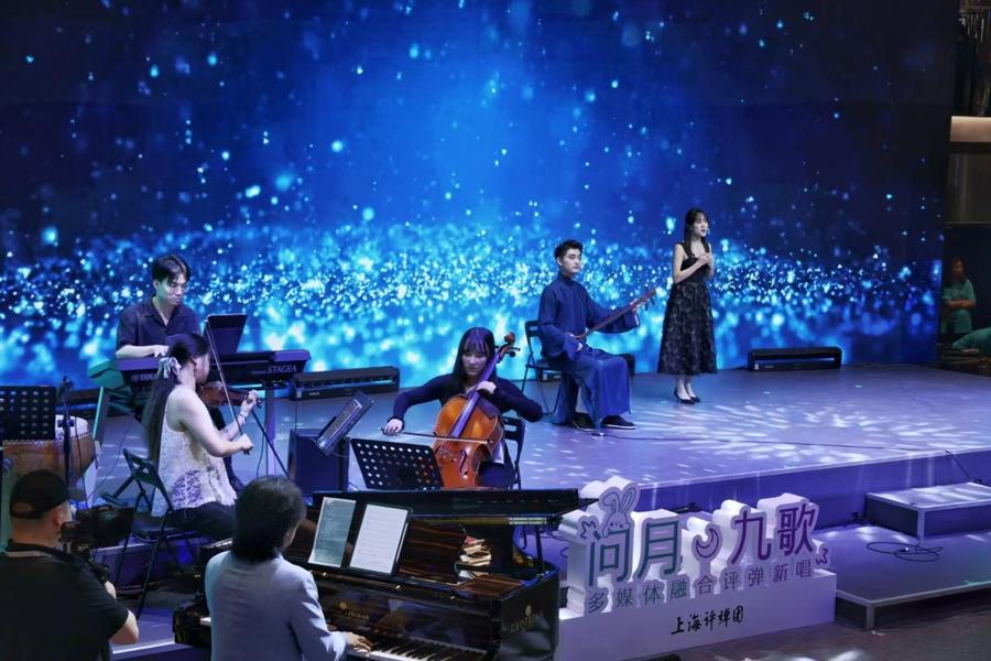 今天,上海評彈藝術傳習所(上海評彈團)原創排演的“問月·九歌”多媒體融合評彈新唱在此首演,吸引不少市民遊客駐足欣賞。參與表演的“小民星”中,既有就讀於上海市戲曲學校的專業學習者,還有從兩個多月前“海派藝術傳習營”中脫穎而出的業餘愛好者。活動總策劃、上海評彈團團長高博文說,這是上海評彈團首次嘗試“小民星選拔—海派藝術傳習營排練—中秋雙舞臺展演”模式,“最主要是鼓勵青少年參與,並以藝術融合的方式推動評彈創造性轉化”。