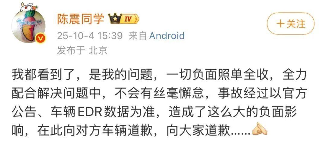 10月4日下午,陳震發微博回應稱:我都看到了,是我的問題,一切負面照單全收,全力配合解決問題中,不會有絲毫懈怠,事故經過以官方公告、車輛EDR數據爲準,造成了這麼大的負面影響,在此向對方車輛道歉,向大家道歉。