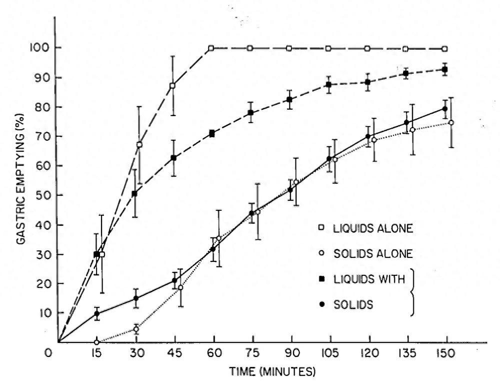 當兩者混合進餐時,液體的排空會受到固體的輕微延遲影響,但固體的排空幾乎不受液體影響。換句話說,一口飯配一小口水,並不會讓食物泡在胃裏動彈不得。