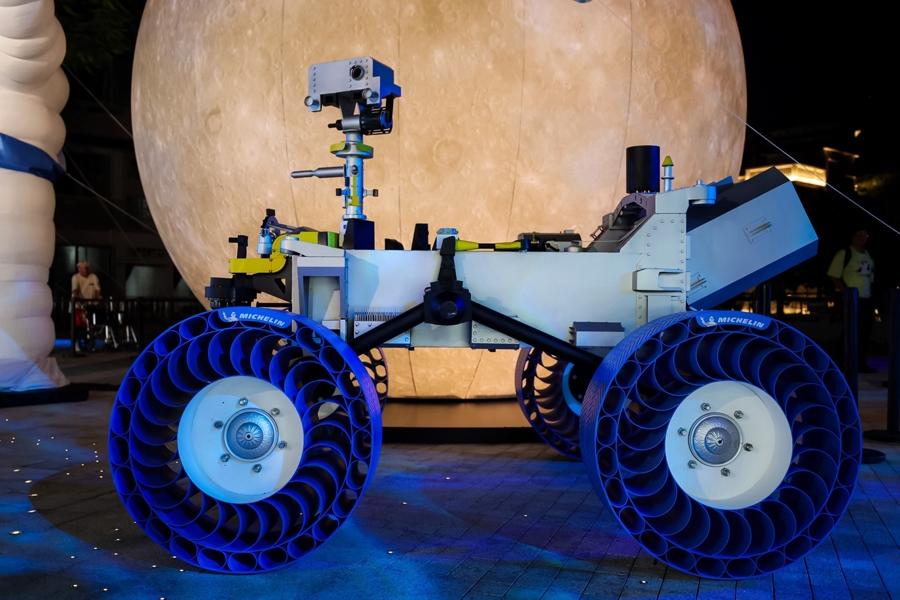 面向更遙遠的未來,米其林不斷延展品牌的探索旅程,憑藉領先的聚合物複合物解決方案,米其林爲月球探測車研發的免充氣輪胎已在去年進博會亞洲首秀。該輪胎能承受太空環境從-240℃至超過100℃的劇烈溫差,並在強輻射環境和鬆軟月壤中仍保持穩定抓地性與抗磨損能力,能夠承受數百萬次形變循環。這一前瞻性項目不僅代表着人類探索未知的勇氣,也將通過技術反哺,轉化爲地面應用的實際解決方案。