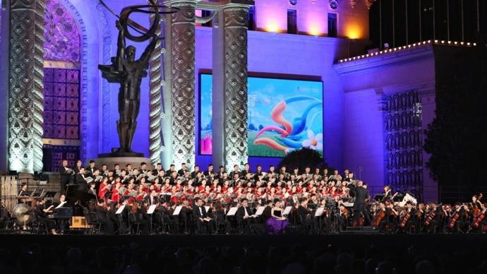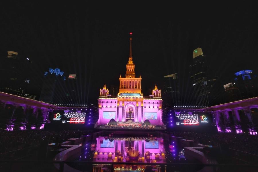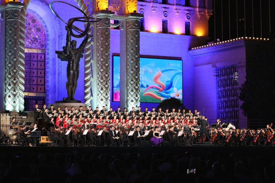 銀月懸於上海展覽中心穹頂之上,清輝與戶外噴水池廣場的絢爛燈光彼此交織——今晚的圓月與國慶、中秋雙節同慶的氛圍格外契合,也爲第二十四屆中國上海國際藝術節特別呈現的大型戶外交響合唱音樂會《布蘭詩歌》,鋪就了一層溫柔的舞臺底色。