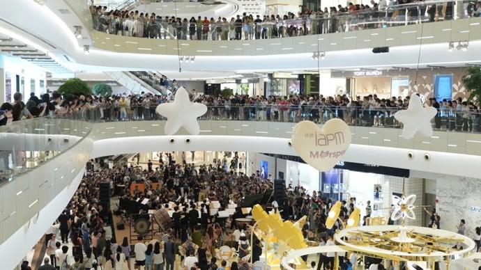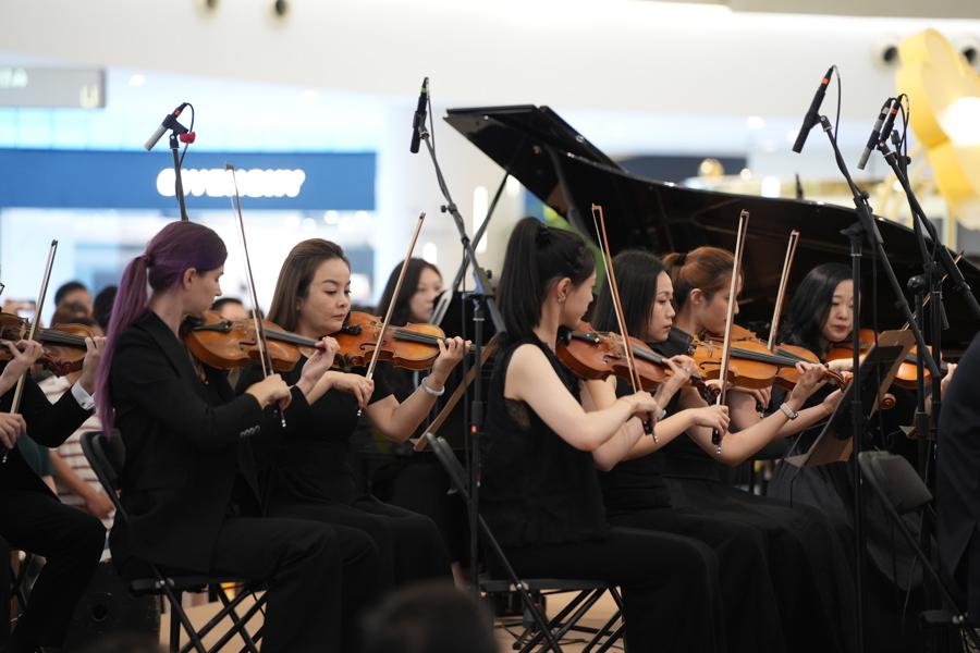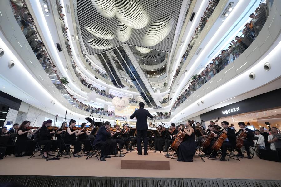 演出現場,指揮範燾攜愛樂匯交響樂團呈現《卡門序曲》《藍色多瑙河》《雷鳴電閃波爾卡》《北京喜訊傳遍邊寨》《激情燃燒的歲月》《春之聲圓舞曲》等多首經典曲目,引得現場顧客駐足聆聽。