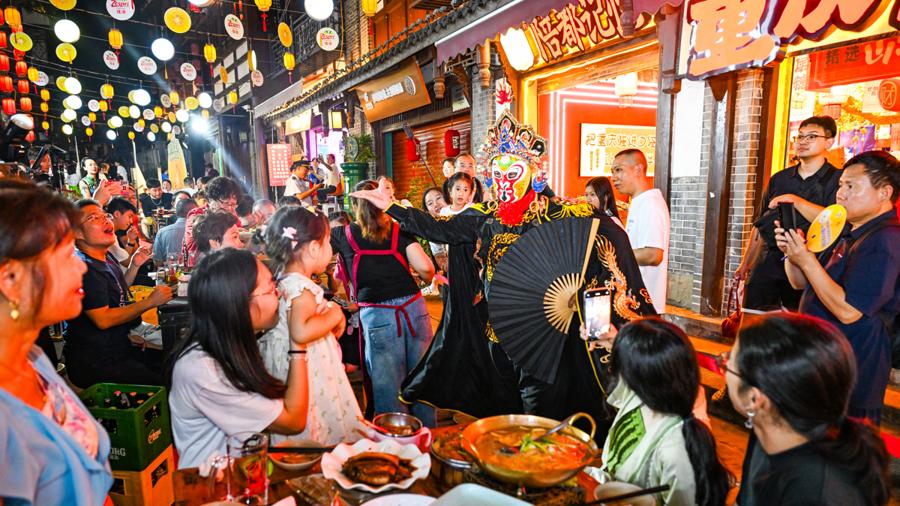 10月5日,重慶磁器口古鎮擺起長街宴,吸引衆多遊客前來品美食、賞民俗表演,共迎中秋佳節。| 新華社 王全超 攝