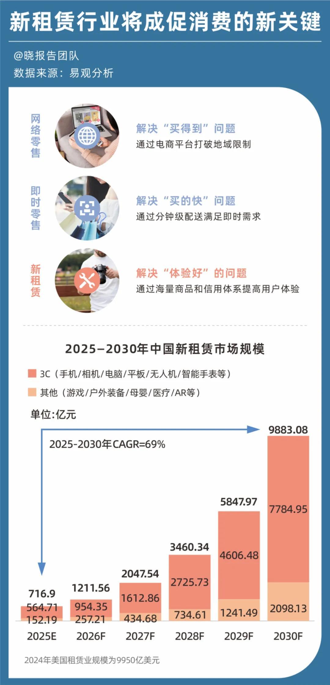 易觀分析給出了更明確的預測:2025年底,中國新租賃市場規模將達716.9億元;到2030年,有望逼近1萬億元,這5年間的複合增長率高達69%。