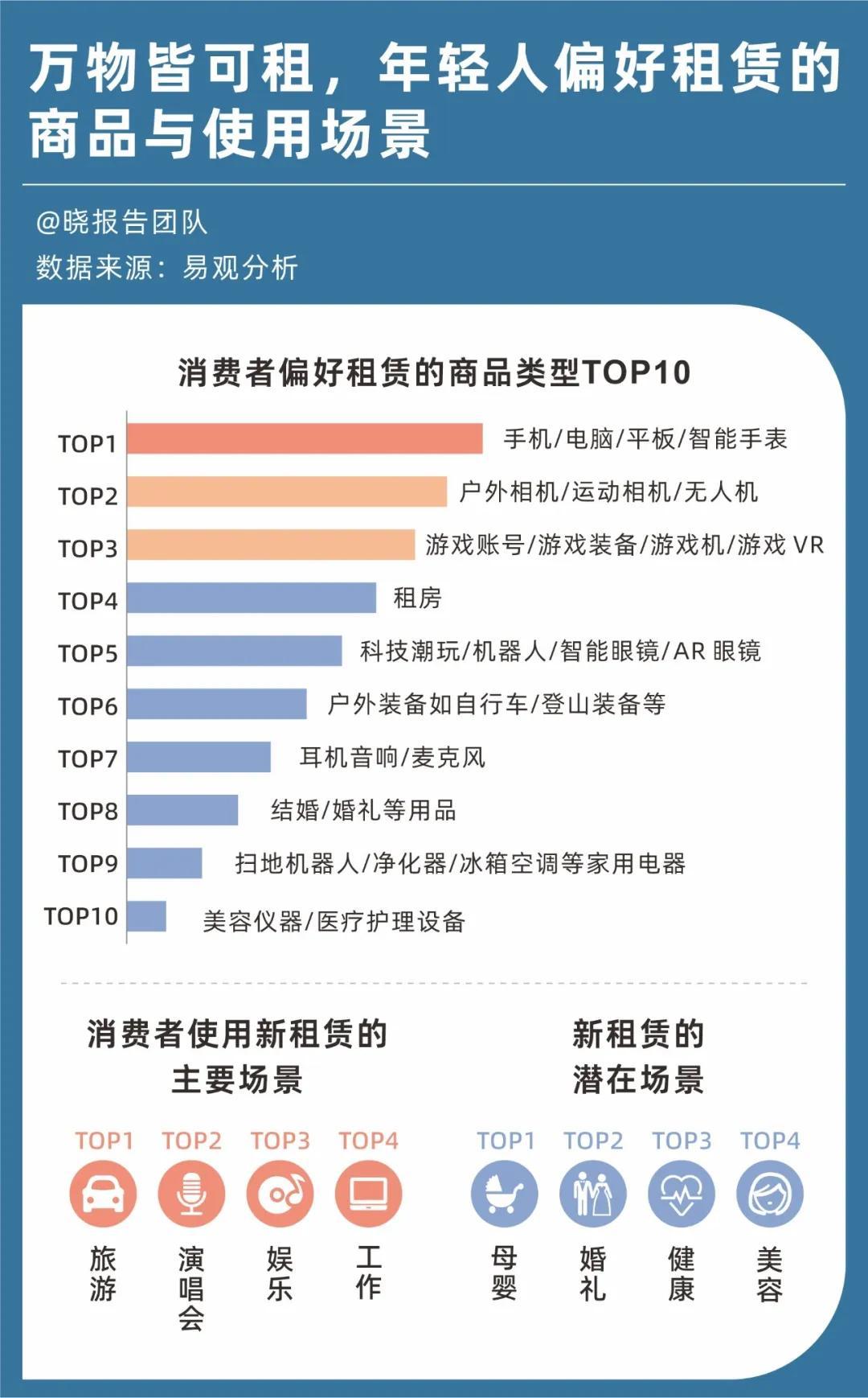 根據易觀分析的報告,手機/電腦/平板/智能手錶穩居消費者租賃偏好的TOP1;戶外相機/無人機、遊戲設備則緊隨其後。這類產品要麼更新迭代快,要麼使用頻次低但體驗感強,於是租賃成了最優解。