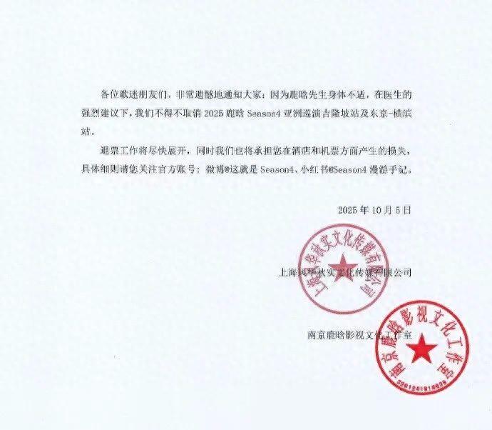 10月6日,“2025鹿晗Season4亞洲巡演”官方微博發佈公告,稱2025鹿晗Season4亞洲巡演吉隆坡站、東京-橫濱站演出取消,相關退票及補償事宜將盡快展開。