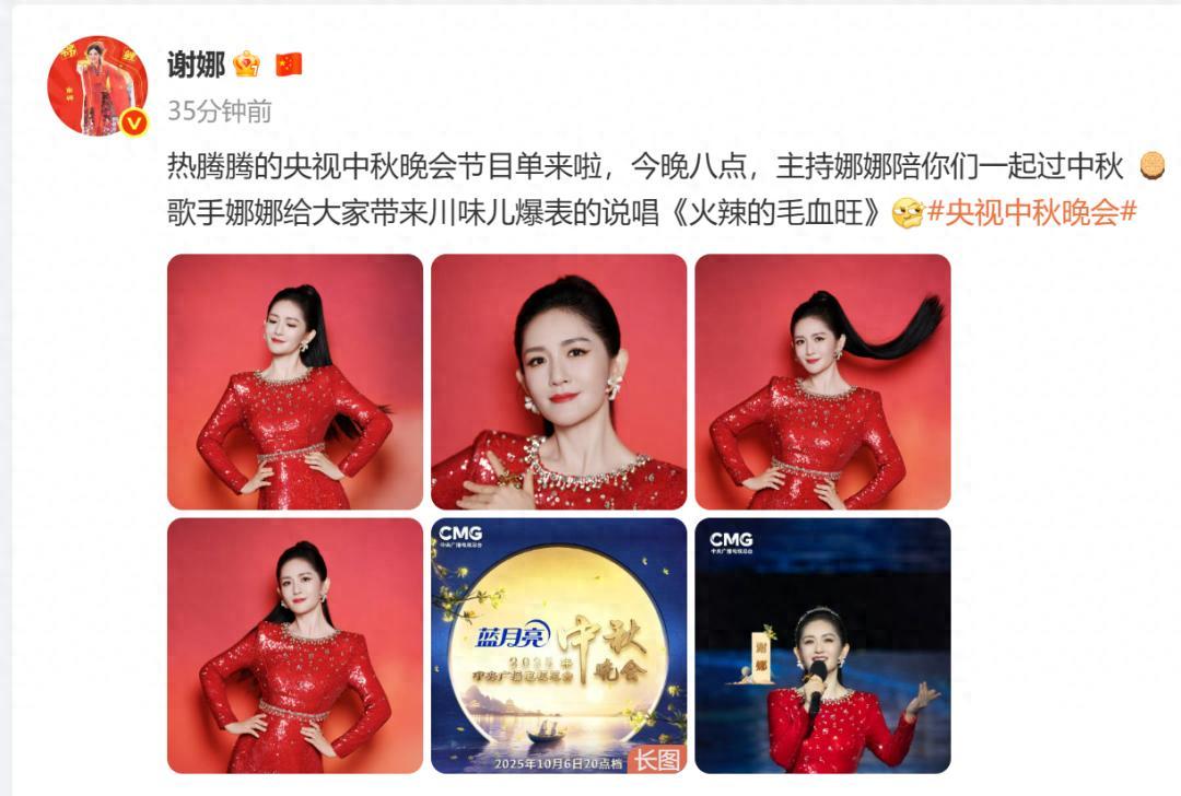 10月6日晚,2025年央視中秋晚會開播前,謝娜發圖劇透晚會妝造,並配文官宣雙重身份:“熱騰騰的央視中秋晚會節目單來啦,今晚八點,主持娜娜陪你們一起過中秋+歌手娜娜給大家帶來川味兒爆表的說唱《火辣的毛血旺》。”
