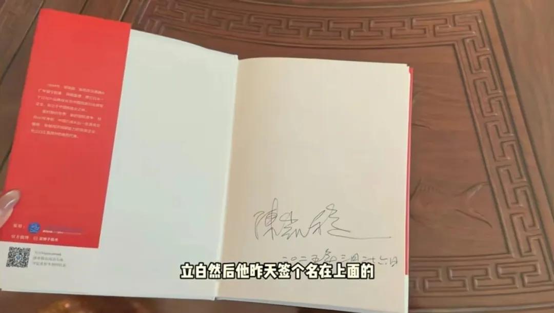 當胡潤帶着“苦盡甘來”玉石擺件與立白集團創始人陳凱旋見面時,陳凱旋用立白的一本傳記圖書進行了交換。
