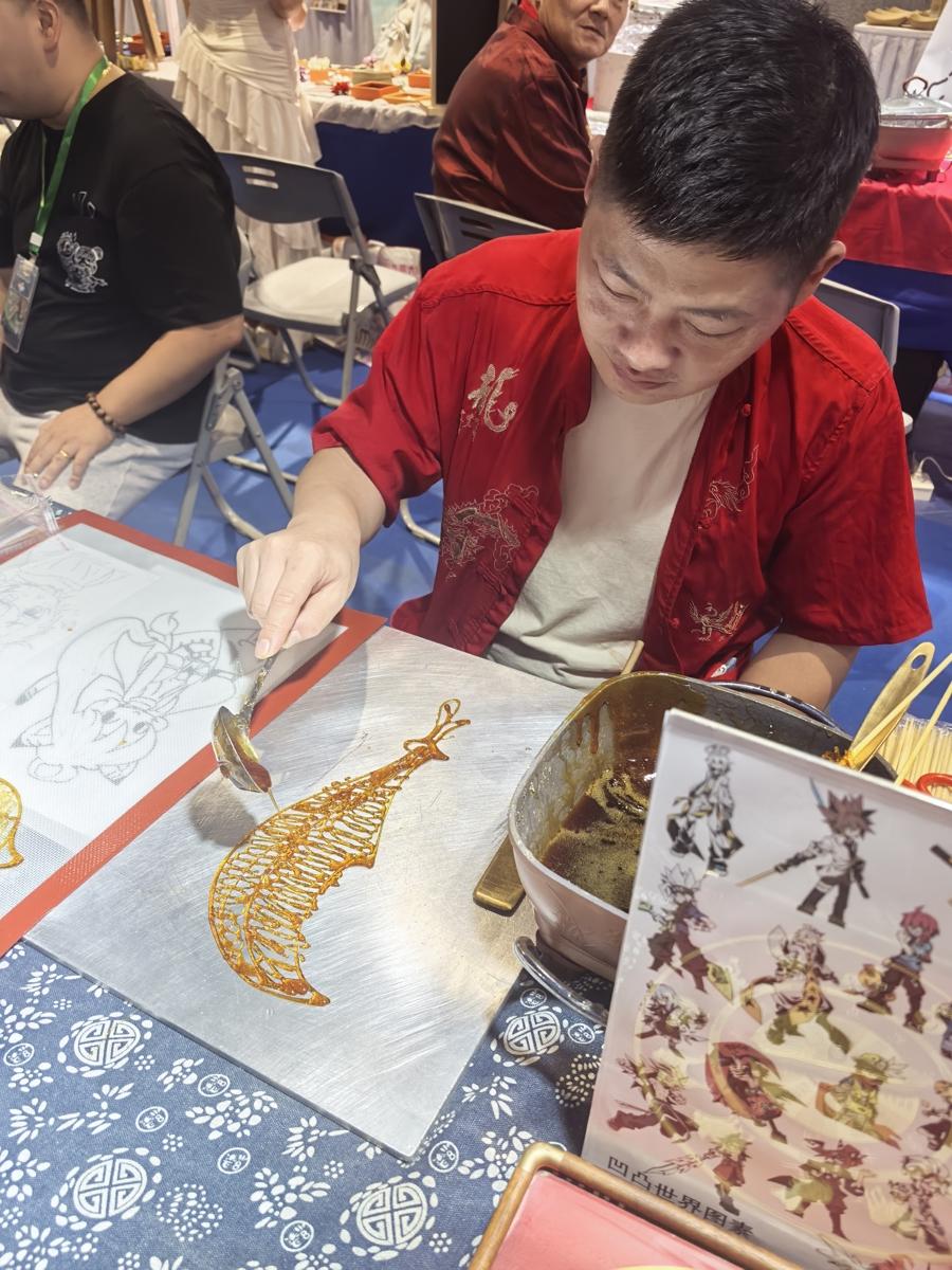 本屆CP展專門設置的“次元鬧傳統”展區,成爲推動老字號品牌、非遺技藝與動漫IP深度融合的創意工坊。該展區以非遺市集、美食體驗等形式,推動非遺突破邊界、走進年輕羣體與大衆生活,實現文化傳承與市場活力的雙向增益。展區內,糖塑、宋錦、絨花、剪紙等10多項非遺技藝與《明日方舟》《凹凸世界》《未定事件簿》《畫江湖之不良人》等熱門IP攜手聯動。掐絲琺琅傳承人陳漪老師正以“掐絲”勾勒輪廓、“點藍”注入靈魂的古老技藝,重塑《陰陽師》世界的風華角色,讓這項非遺在與二次元文化的對話中,展現出跨越時空的生命力。