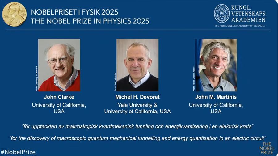 北京時間10月7日,瑞典皇家科學院宣佈,2025年諾貝爾物理學獎授予科學家約翰·克拉克(John Clarke)、米歇爾·H·德沃雷特(Michel H. Devoret)和約翰·M·馬丁尼斯(John M. Martinis),以表彰他們“在電路中發現宏觀量子力學隧穿和能量量子化”方面的傑出貢獻。