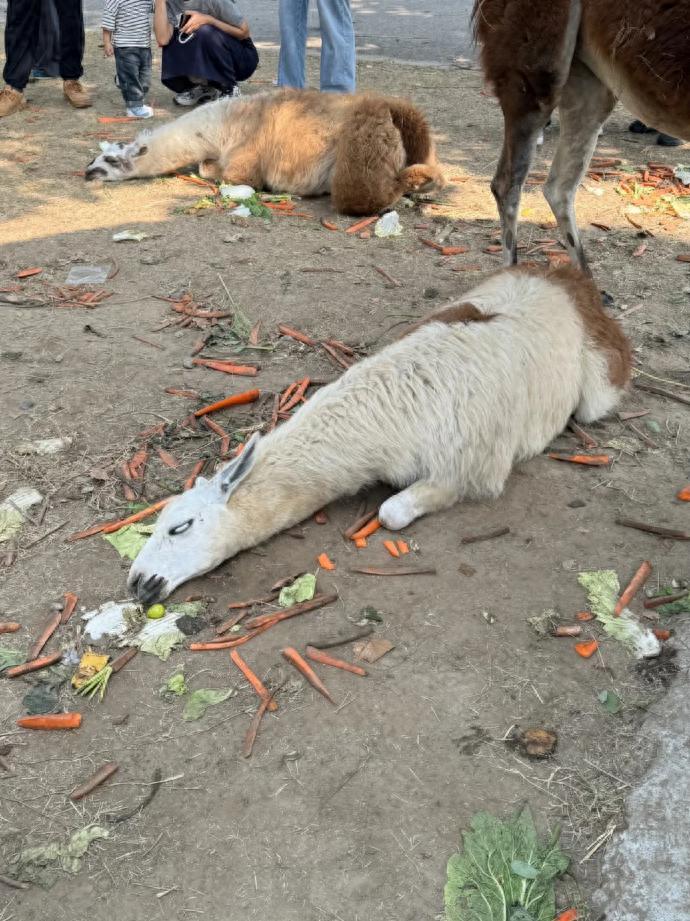 網帖圖片顯示,2只羊駝躺倒在地,眼神呆滯,四周散落着大量胡蘿蔔、白菜等食物殘渣。有網友留言調侃:“它們真的喫不下了。”更有人曬圖稱:“帶了五斤胡蘿蔔,扔了四斤。”也有人擔心“動物這樣喫會撐死”。還有網友質疑:“眼睛都翻白了,這不像是正常狀態。”