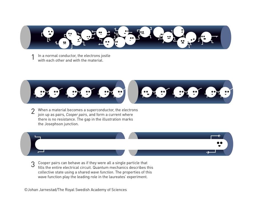 按照今年諾貝爾物理學獎的頒獎詞,三位科學家使用了一系列實驗來證明量子世界的奇異特性不僅僅存在於原子態,在大到毫米的器件中也同樣存在。簡言之,他們因爲宏觀量子效應的發現而獲獎。