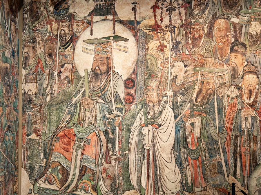 進入殿宇須換鞋套,嚴禁拍照。抬頭仰望,與400平方米壁畫舞臺上各安其位的近300身神靈交換眼神,無人不驚歎。這是朝謁元始天尊的浩蕩衆神:八位高達三米的主神,佔據隊伍中心,威嚴莊重;前方,青龍、白虎二星君開道,後方,三十二天地君護持,周圍環繞仙曹、仙官、天丁、力士、太乙、侍臣、金童、玉女、二十八宿等諸神。人物或低語交談,或凝神沉思,或側耳傾聽,或注目凝視,個個神采奕奕,表情動作無一雷同,彼此間神態呼應,氣韻貫通,形成有機而磅礴的整體。