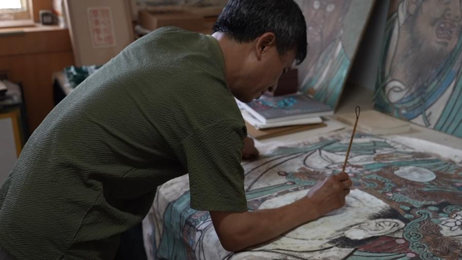 說起永樂宮壁畫,劉移江的眼神格外明亮。在永樂宮,他臨摹、研習壁畫,一晃30年過去了。“小時候就愛往永樂宮的臨摹室鑽,看那些畫畫的大人們怎麼把牆上的神仙‘搬到’紙上。高中沒事還過去幫幫忙,給畫家們調調顏色、打打下手……”劉移江就是土生土長的芮城縣人,家中三代都與文物文化結下深厚情緣,爺爺籌建了芮城縣博物館,父親則在永樂宮從事園林設計,也因而,永樂宮成爲他兒時記憶中溫暖的拼圖。從小種下的喜愛,讓劉移江從大學美術專業一畢業,堅定地回到了永樂宮,成爲真正的“守宮人”。