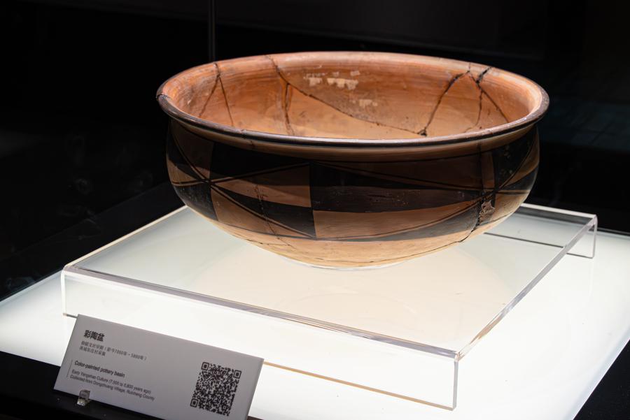 獨享“單間”展櫃待遇的一隻彩陶盆,距今6000多年,以棕紅色陶衣爲底色,用黑色繪出三角形幾何紋,優美流暢,隨觀衆目光流轉,甚至會產生菱形格、米字格、迴旋紋等變化。它出土自芮城縣東莊遺址,數千年依舊絢麗如新,成爲史前藝術浪潮中的一抹亮色。