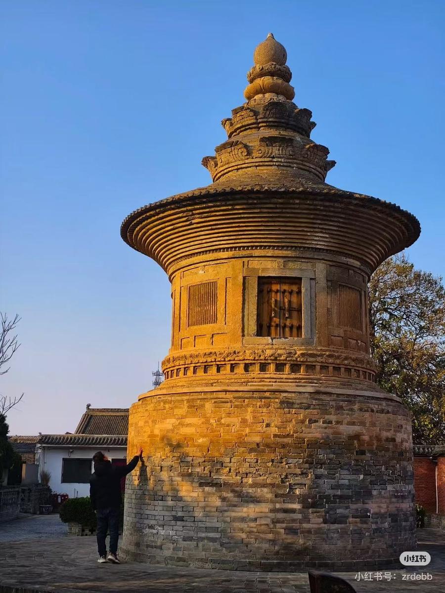 推開寺北曲村無名小路上兩扇斑駁的紅鐵門,1200多歲的唐代泛舟禪師塔孤零零矗立在院落裏。這是我國唐代圓形單層磚塔孤例,爲第五批國保。基座、塔身與塔剎盡顯“黃金分割”之美,頂端精雕細琢的山花、蕉葉、束帶、仰蓮、寶蓋等裝飾尤讓人挪不開眼。