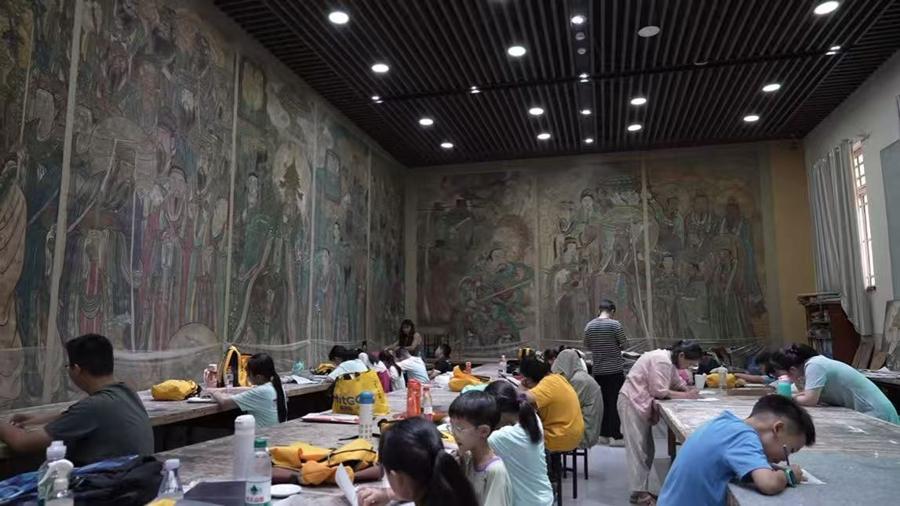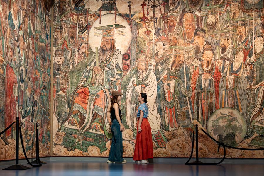 守護以外,深度挖掘藝術聖殿內涵的多維探索,更讓永樂宮文化在創造性轉化與創新性發展中,煥發新生。一方面,永樂宮開闢着越來越多樣的研學課堂:臨摹者的筆尖與元代畫師的粉本隔空唱和,斗拱展示演繹“勾心鬥角”的營造傳奇,搬遷體驗還原當年“化整爲零”的不可能……另一方面,科技與人文的握手,讓永樂宮文化基因在數字時代獲得全新的表達方式,以形形色色的主題展覽走出去。