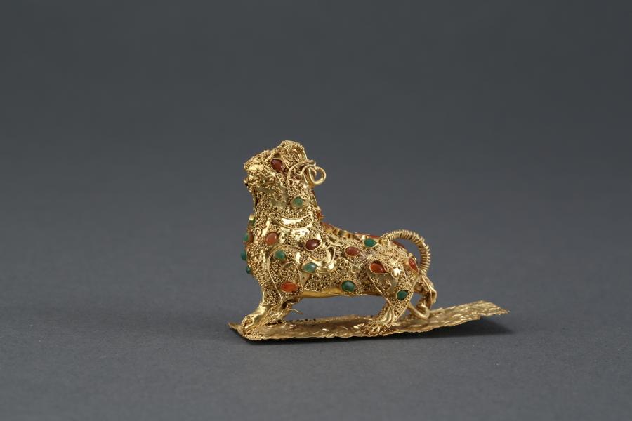 金片捏出辟邪似虎身軀。金薄片剪成細條、揉搓成絲,金線掐絲纏繞出辟邪的角、翅、尾。辟邪身上零散鑲嵌有紅瑪瑙、綠松石,還有不計其數的金粟粒焊綴於體表,表現神獸捲曲的毛髮。這尊掐絲鑲嵌金辟邪長度僅4釐米,毫釐天地、巧奪天工——能夠想象,漢代金工工匠超絕的技藝、獨具的匠心。