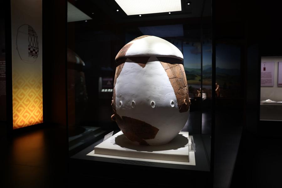 在牛河梁遺址博物館內的第一地點考古成果展示區,記者看到了一件碩大的帶蓋陶缸。它殘高75釐米,口徑50釐米,最大腹徑70釐米;表面由交叉的線條紋理裝飾,中下部有一圈圓形凸起。“3號臺基上發現了陶缸、圓陶片和陶罐的組合,其中的陶缸是目前發現的這一時期體量最大的陶器。”據講解員尹旭宏介紹,這件器物可能與祼禮相關,“在祭祖儀式中扮演着重要角色”。