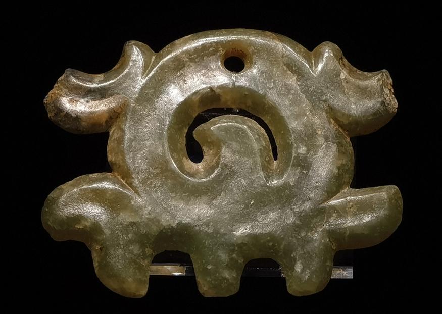 勾雲形玉器:此類器物是紅山文化代表性玉器之一,通常出土於等級較高的中心大墓內,並置於墓主人的身體關鍵部位。器型呈長方形片狀,一般中心鏤雕成勾雲形盤卷,四角卷勾,周邊較薄似刃狀。