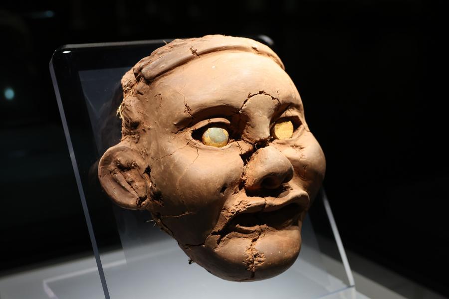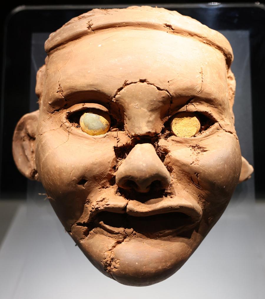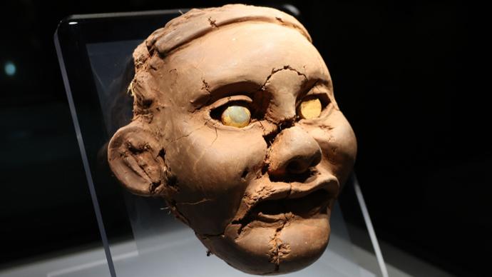 女神頭像是一尊塑泥像,塑泥爲黃土質,摻草禾一類植物;內胎泥質較粗,捏塑的各個部位爲細泥質。“出土時,女神頭像的顏面呈鮮紅色,嘴脣塗着飽滿的紅彩,彷彿先民剛爲她完成最後的妝點。”朝陽市牛河梁遺址管理處處長、朝陽牛河梁遺址博物館館長張雪說。經歷數千年歲月,“紅山女神”的鼻子已經脫落,下頜略有殘缺,但左耳的耳洞清晰可辨,這說明當時的女神像佩戴着耳飾,是充滿生活細節的信仰載體。“這種藝術表達標誌着紅山先民的雕刻水平達到相當高度,他們不再滿足於簡單的形態模仿,而是用藝術承載精神世界的追求。”