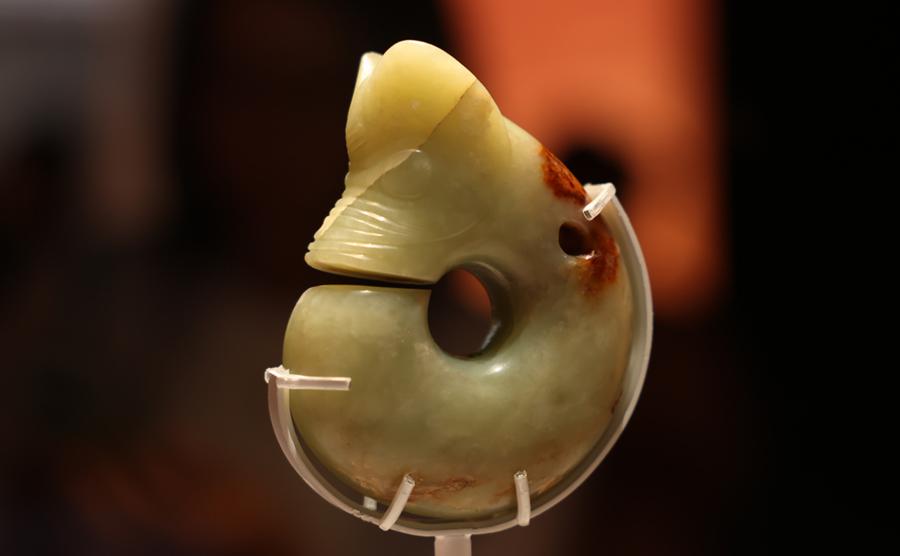 玉豬龍:出土於牛河梁遺址第二地點一號冢4號墓,位於墓主人的胸部。玉豬龍是紅山文化極具代表性的一種器型,體現了中國龍的早期形態。