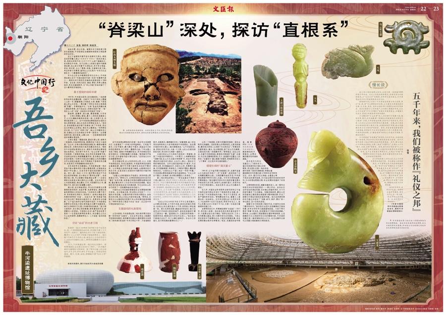 在遼寧省朝陽市建平縣與凌源市交界處,綿延至此的努魯兒虎山(漢語意爲“脊樑山”)結成多道土梁,因狹長的犛牛河(或稱牛耳河)從梁下蜿蜒而過,故而得名牛河梁。位於丘陵之上的新石器時代晚期遺址羣,沿山脊分佈着51處遺址點,其中有女神廟、祭壇、積石冢,出土了塑像、彩陶、玉器等珍貴文物。考古學泰斗蘇秉琦,曾將紅山文化稱爲“中華文化總根系中一個最重要的直根系”。
