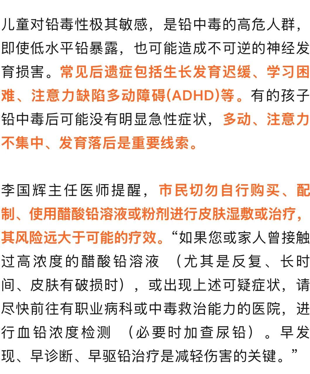 杭州市紅十字會醫院職業病科李國輝主任醫師指出,醋酸鉛是一種水溶性鉛鹽,它可以通過皮膚表皮、毛囊、皮脂腺、汗腺等結構被吸收,進入皮下毛細血管。如果皮膚存在微小傷口、皸裂、溼疹、汗皰疹,毒性物質便可長驅直入,醋酸鉛的滲透吸收速度會急劇增加。
