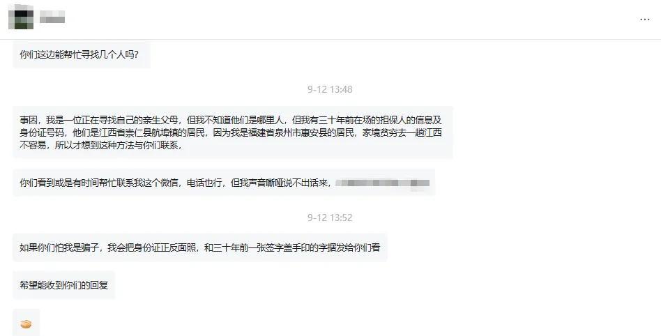 2025年9月12日,一個普通的秋日,“崇仁公安”微信公衆號後臺收到了一則特殊的尋親求助信息。遠在福建的小杰(化名)懷着忐忑的心情留言,字裏行間透露着三十多年來的期盼與忐忑。一張字跡模糊的過繼擔保紙條,幾個若隱若現的人名,成爲尋親的唯一線索。後臺管理員敏銳地意識到這條求助的特殊性,立即啓動尋親協助機制,將希望之火傳遞至航埠派出所。