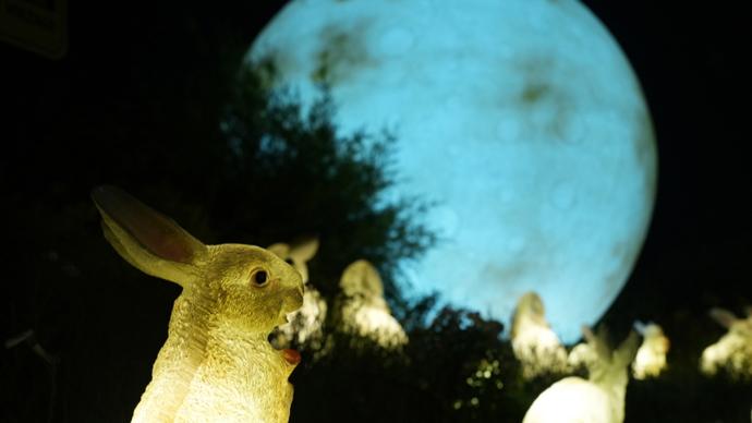 白天,這輪“月球”是科普藝術,表面復刻了真實的月貌,環形山與月海交織,在陽光下呈現出一定的立體感,就像是從宇宙中採擷而來。綠植造型的映襯下,30只小兔子圍繞着月亮,構成一幅寧靜和諧的畫面。當夜幕降臨,華燈初上,變幻隨之而來——堅硬的“月球”瞬間化爲溫潤的“明月”,通體散發出柔和而皎潔的光芒。那羣白日裏安靜的小兔子也在燈光的點綴下被喚醒,變得靈動活潑,圍着月亮嬉戲玩耍,勾勒出“玉兔伴月”的詩意畫卷,將中國古典神話中的浪漫意境呈現在眼前。