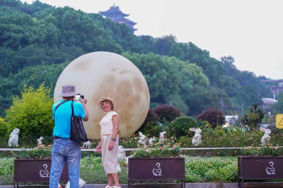 國慶長假期間,位於杭州吳山廣場的吳山花海里打造的一處中秋主題燈飾,成爲杭州的熱門打卡點之一。一輪直徑3米的“超級月亮”與一羣萌趣“玉兔”出現在草坪上,以其白天的“月球形態”與夜晚的“皎皎滿月”絢爛造型,吸引了許多市民遊客前來,共賞這輪提前升起的“吳山明月”,沉浸在濃郁的雙節氛圍之中。