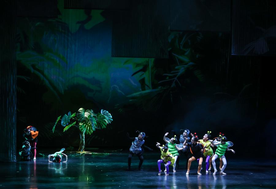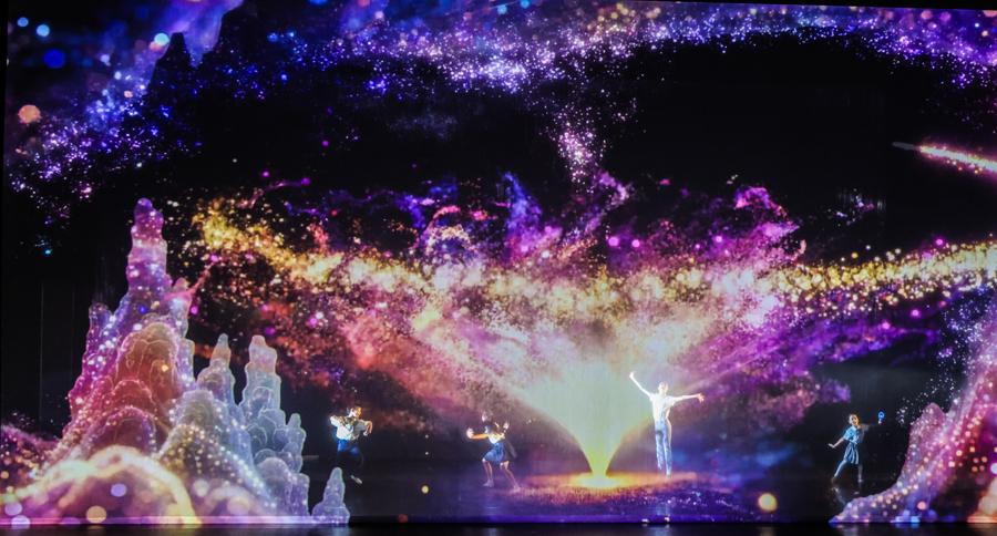 值得一提的是,演出舞臺宛如一個巨大的“魔法盒子”。充滿想象力的舞臺佈景和裸眼3D視頻技術,隨着小演員的舞蹈瞬間變幻——時而化爲螢火蟲飛舞的“夏至”夜晚,時而變爲金燦燦的“芒種”麥田,爲現場觀衆營造一個如夢似幻的童話世界。