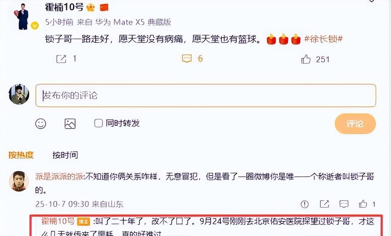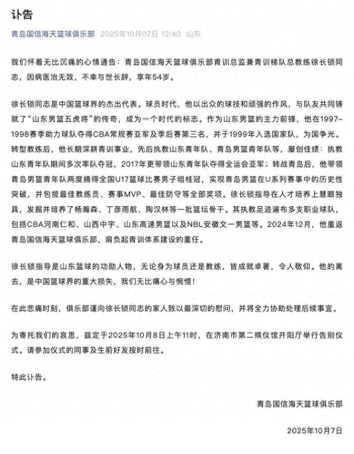 徐長鎖因病去世,年僅54歲!楊瀚森發文緬懷——2025-10-08 極目新聞