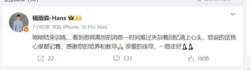 楊瀚森在社交媒體上發文表達了對恩師徐長鎖的深切懷念:“剛剛結束訓練……看到恩師離世的消息一時間難過夾雜着回憶湧上心頭,您說的話我心裏都記着,感謝您的培養和教導。親愛的徐導,一路走好。”