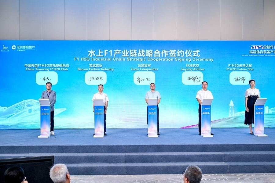 峯會現場,水上F1產業鏈戰略合作正式簽約。中國天榮F1H2O摩托艇俱樂部、寶武碳業、雲路復材、林洋航空、F1H2O未來之星達成戰略合作,標誌着F1H2O賽事平臺將與國內新材料高端裝備製造龍頭企業攜手共進,讓賽事裝備的技術創新與產業化落地生花。