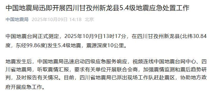 據中國地震臺網正式測定,10月9日13時17分在四川甘孜州新龍縣發生5.4級地震,震源深度10公里,震中位於北緯30.84度,東經99.86度。