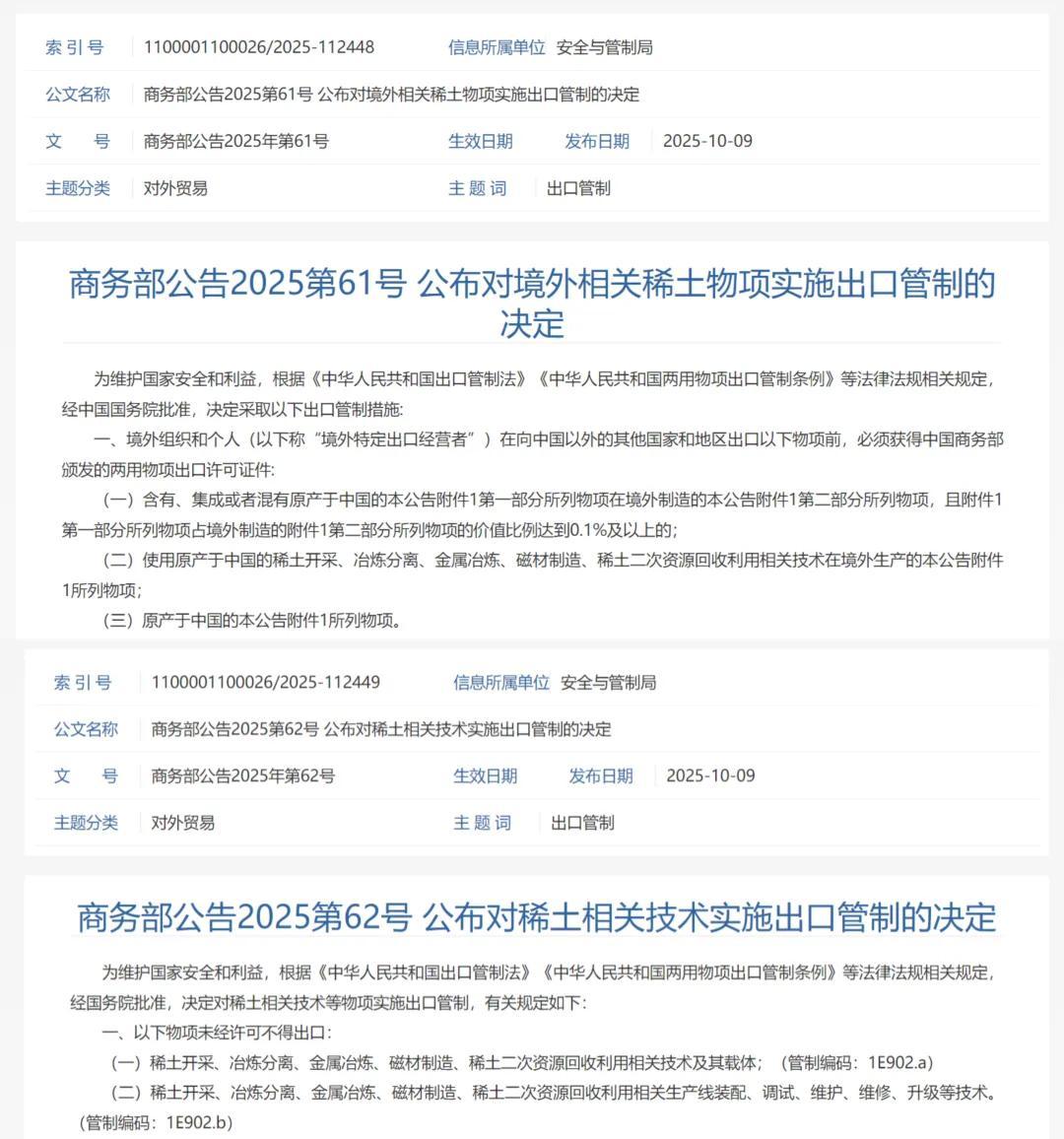 昨天,商務部發布2025年第61號和第62號公告,分別公佈對境外相關稀土物項實施出口管制的決定,以及對稀土相關技術實施出口管制的決定。