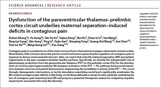 童年時期遭遇的逆境,如虐待、忽視或母嬰分離,不僅會造成即時傷害,更會深遠影響個體成年後的心理健康與社會功能。其中,共情能力的缺陷尤爲顯著,但其背後的大腦機制一直不甚明確。10月9日,國家兒童醫學中心、上海交通大學醫學院附屬上海兒童醫學中心發育行爲兒科江帆教授、浙江省甌江實驗室劉明剛研究員與上海交通大學醫學院徐天樂教授團隊合作在《科學·進展》上發表研究論文,首次系統闡明生命早期的母嬰分離應激如何導致成年後對同伴疼痛“感同身受”的能力下降。