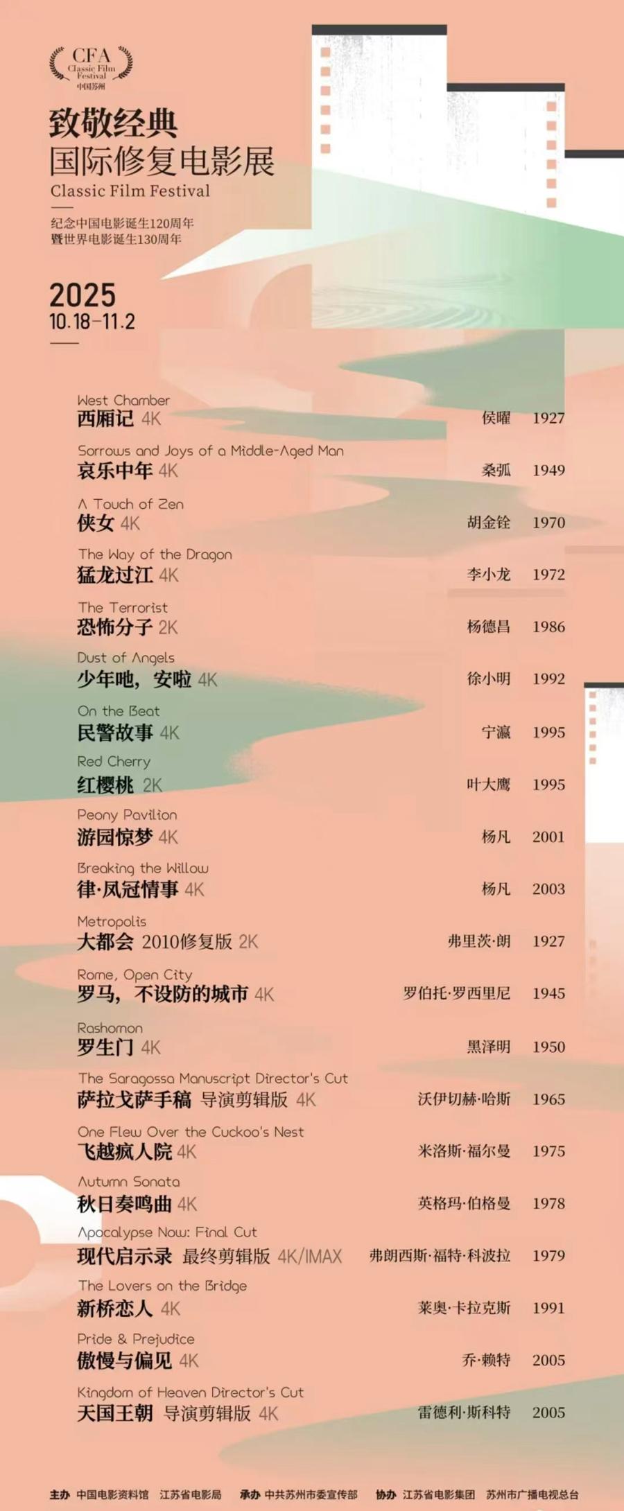 10月18日至11月2日,蘇州將迎來第六屆“致敬經典·國際修復電影展”,《秋日奏鳴曲》《現代啓示錄》《遊園驚夢》《新橋戀人》等20部中外修復經典影片將登陸蘇州秋日銀幕,“經典影像的喚醒與重塑”主題論壇、人文電影課等精彩活動也將同步舉辦。