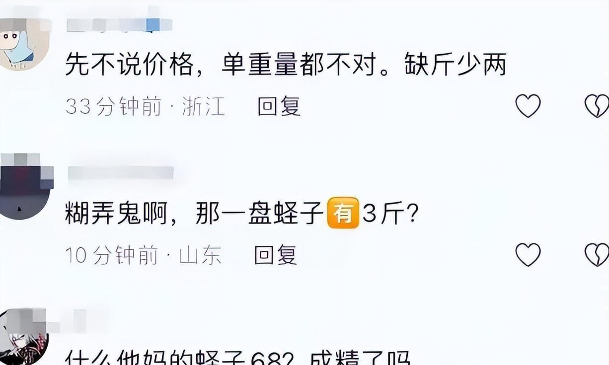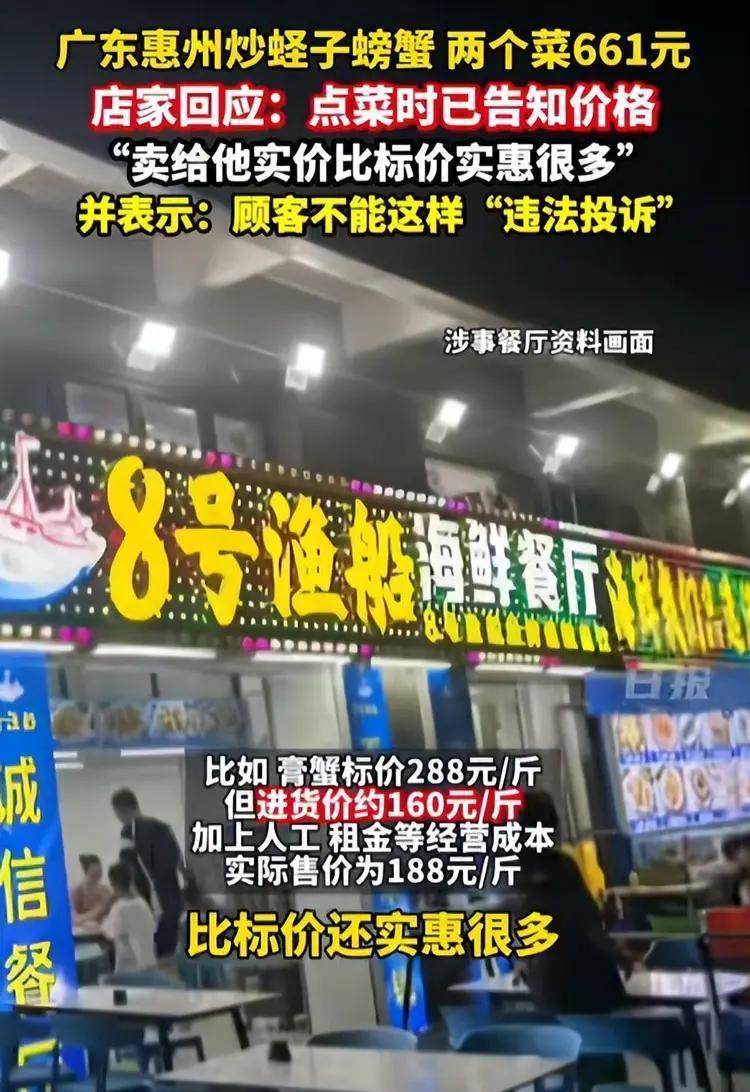 有經常買海鮮的網友算了一筆賬:國慶期間惠州市場上膏蟹最多80元一斤,蟶子約25元一斤,兩盤菜成本最多150元,老闆含淚賺了500多元,更有人質疑分量:“那盤螃蟹看着頂多1斤出頭,怎麼看也湊不夠2.4斤?”