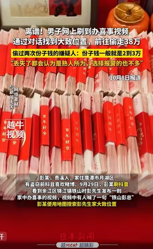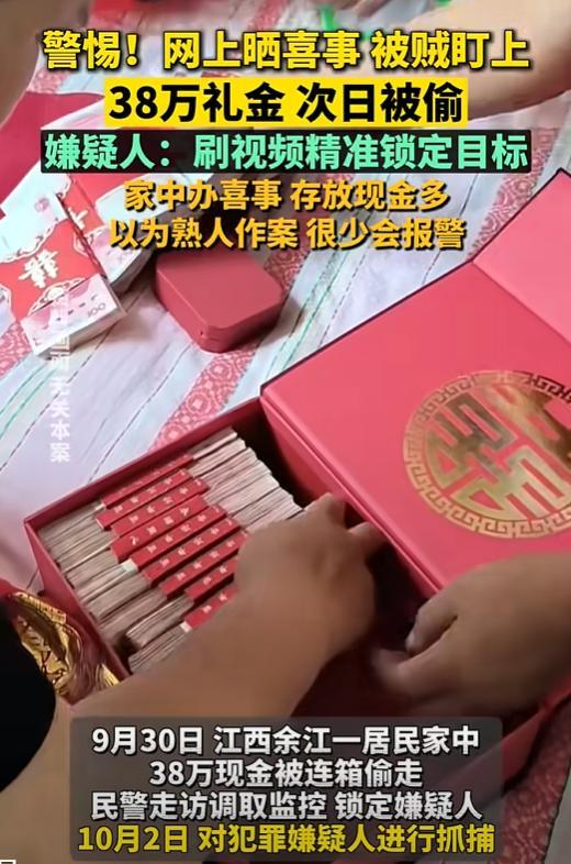 江西彭先生最近爲兒子辦了一場熱鬧的婚禮,這本是件大喜事。沉浸在喜悅中的他在社交平臺分享了一段婚禮視頻,卻沒料到這段視頻會被幾十公里外的陌生人盯上。一夜之間,裝有38萬元禮金的行李箱不翼而飛,而這些錢包括了賓客的份子錢、兒媳的陪嫁和親友見面禮。
