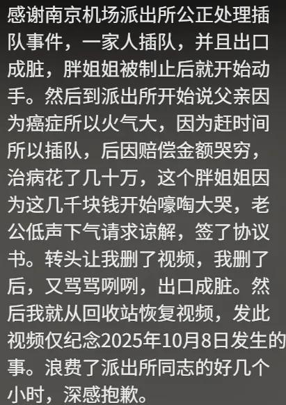 機場公安(航站樓第二派出所)介入,涉事雙方在民警主持下達成調解協議:打人方需向受害乘客公開道歉,並一次性賠償3500元,另支付其改乘高鐵至北京的530元費用(總計4030元)。協議明確雙方糾紛“到此了結”,若打人方未履行,公安機關將依法給予治安處罰。