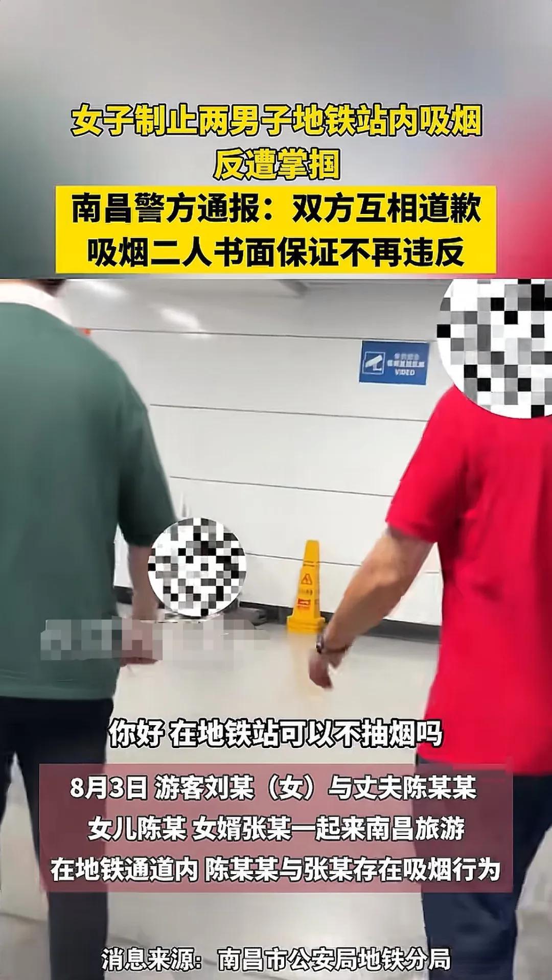 無獨有偶,今年8月3日,江西南昌地鐵站內也發生了一起類似的衝突。徐女士在地鐵通道內製止兩名男子抽菸,表示“不想吸二手菸”。