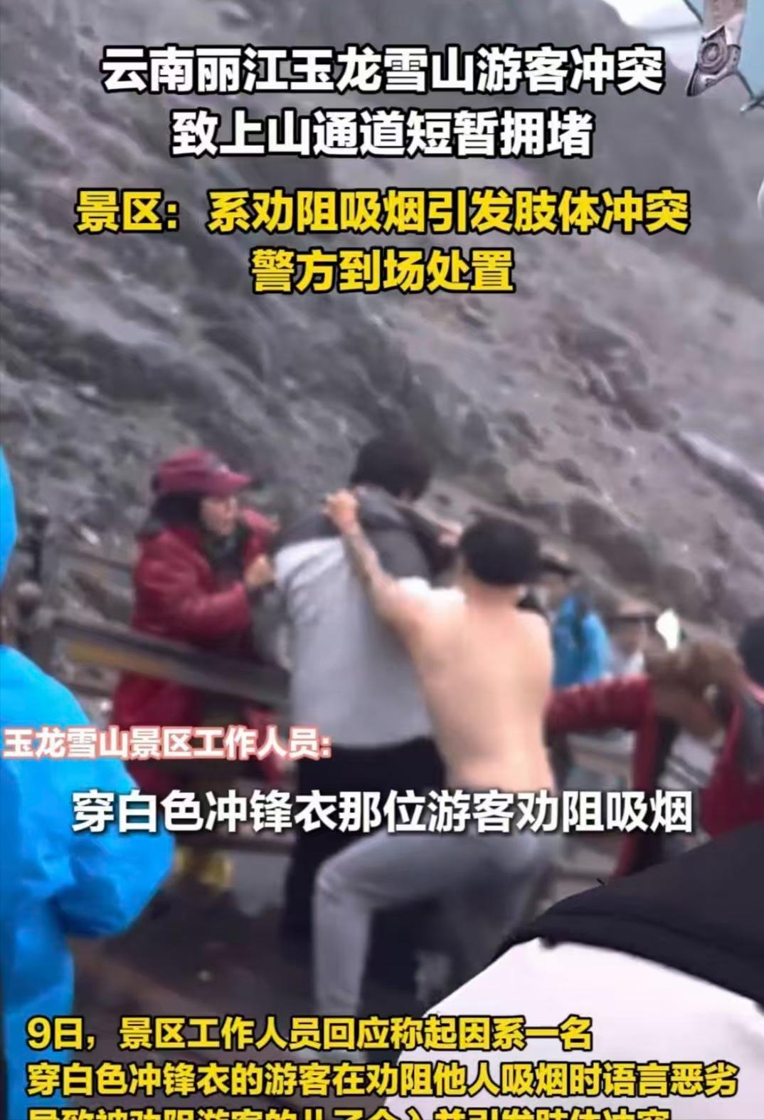 這起衝突發生在玉龍雪山景區索道附近,當時,一名身穿白色衝鋒衣的男性遊客看到有人在景區內吸菸,便上前勸阻。