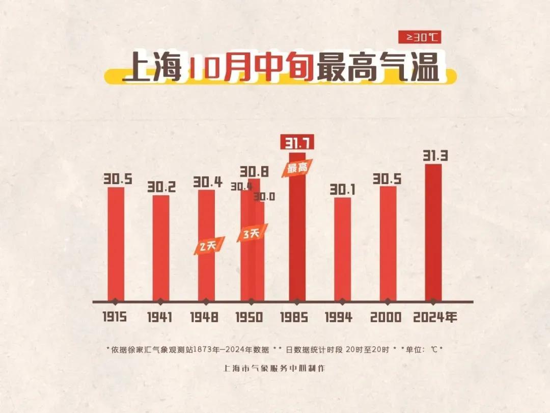 通常進入十月中旬,徐家彙站日最高氣溫很少超過30℃。1872年建站以來,僅有11天達到或超過30℃,其中1985年10月12日極端最高氣溫曾達31.7℃。