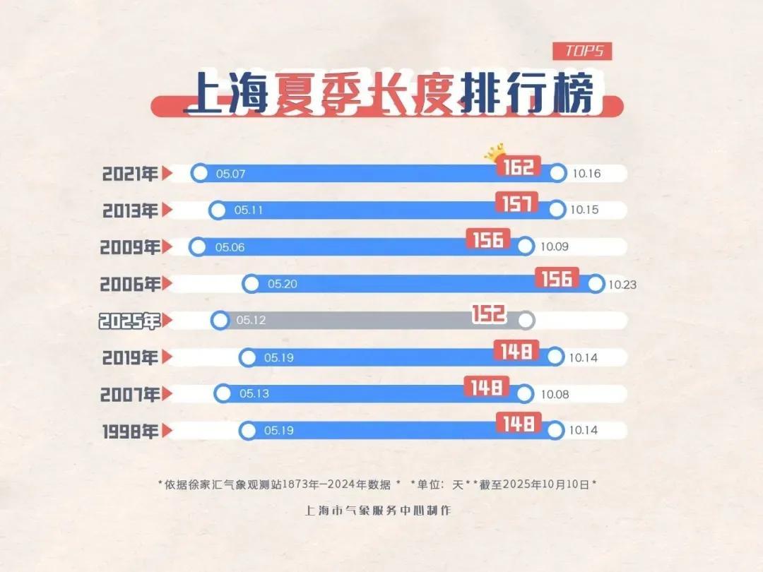 根據徐家彙站數據統計,上海常年平均夏季長度約爲134天,史上最長夏季有162天(2021年)。今年夏季已達152天,躋身歷史第四高位。根據目前預報來看,進入歷史前三位毫無懸念。